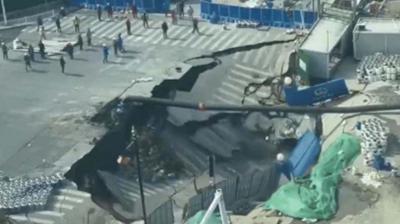 चीन में सड़क धंसी, 20 मीटर चौड़ा गड्ढा बना, पाइपलाइन फटने से हादसा
