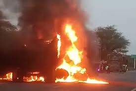 राजस्थान: बस-ट्रक टक्कर के बाद आग का गोला बनी बस