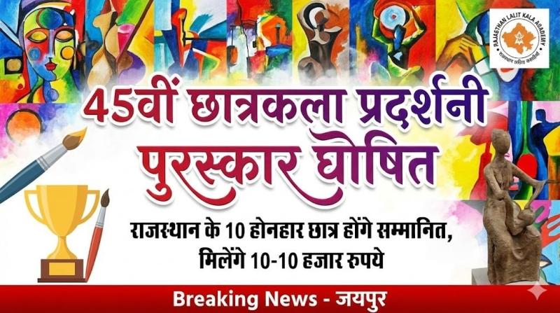 जयपुर 5 फरवरी । राजस्थान ललित कला अकादमी की 45वीं छात्रकला प्रदर्शनी के निर्णायक मण्डल ने राज्य के 10 छात्र-छात्राओं की कलाकृतियों को पुरस्कार योग्य घोषित किया है।