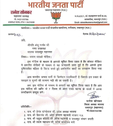 दरअसल, वीडियो वायरल में दिव्यांग दृष्टिहीन महिला से बदसलूकी करने वाली भाजपा नेत्री अंजू भार्गव नगर उपाध्यक्ष है. उनकी इस बदसूलकी की वीडियो वायरल होने के बाद भाजपा के जबलपुर महानगर अध्यक्ष रत्नेश सोनकर ने भाजपा नेत्री अंजू भार्गव को स्पष्टीकरण के लिए नोटिस जारी किया है. नोटिस में भाजपा नेत्री को जवाब देने के लिए 7 दिन का समय दिया है।