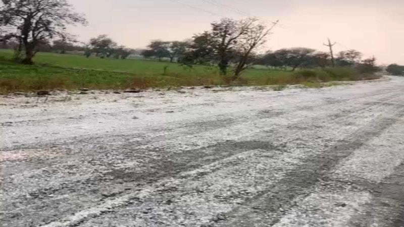 नीमच: मध्य प्रदेश के नीमच में रविवार शाम अचानक हुई बेमौसम बारिश और भीषण ओलावृष्टि ने पूरे क्षेत्र को सफेद चादर से ढक दिया. हालात ऐसे थे कि सड़कें और खेत-खलिहान कश्मीर की तरह बिल्कुल सफेद हो गए, लेकिन यह सफेदी सुकून नहीं बल्कि किसानों के लिए बर्बादी का संदेश लेकर आई. अचानक हुई ओलावृष्टि ने लहलहाती फसलों को काफी नुकसान पहुंचाया है.