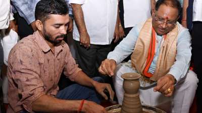 मुख्यमंत्री विष्णु देव साय ने चाक पर दिखाई कलाकारी, बनाई मिट्टी की कटोरी